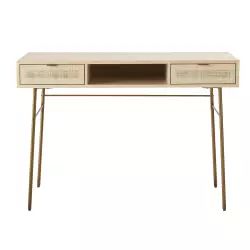 Votre ado est à la recherche d'un espace de travail tendance et avec du style ? Optez pour le bureau bicolore 2 portes 2 tiroirs cannage en rotin YSEE . Avec ses façades en rotin et ses pieds obliques, il appréciera son coté faussement simple, un brin rétro. On craque pour son alliance du blanc et du cannage et le détail de ses poignées en laiton qui offriront une pointe d'élégance. Côté rangement, il y trouvera l'espace nécessaire pour y ranger dossiers et fournitures. Pour une déco moderne, placez sur ce bureau une lampe en métal coloré, effet pop garanti !