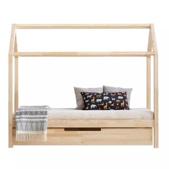 Le lit cabane Célestine 70x140, avec sa forme de cabane douce, offre aux jeunes enfants un espace de sommeil et de jeu sécurisé et confortable, idéal pour les petites chambres.Caractéristiques produitCollection : CélestineFabrication EuropéenneCouleur : Bois naturelMatériaux : Bois de pin - ContreplaquéLit : Poids maximum conseillé : 90 kg - Tiroir pouvant servir de lit d'appoint inclus - Fond du tiroir en sommier à lattes - Dimensions conseillées pour le matelas du tiroir : 70 x 130 x 12 cm non inclus - Sommier à lattes inclusPoids et dimensions : Lit : 20 kg - 149 x 76 x 143 cmCouchage : 70 x 140 cmPoids et dimensions : Tiroir : 15 kg - 138 x 73,6 x 12 cmConditionnement : Produit livré, avec sommier, avec tiroir et sans matelas, à monter, avec notice incluseGarantie : 2 ansNombre total de cartons : 2