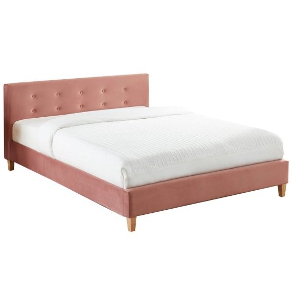 - Style scandinave - Lit adulte - 2 places - Sommier 24 lattes en bois massif de peuplier - Tête de lit rectangulaire capitonnée 152x68x10,5cm - Rembourrage mousse - Revêtement 100% velours - Couleur : rose blush - Structure en métal - Pieds en bois massif d'hévéa de hauteur 10cm - Dimensions de couchage : 140x190cm - Dimensions totales (Lxlxh): 209,5x152x78cm - Garantie 2 ans